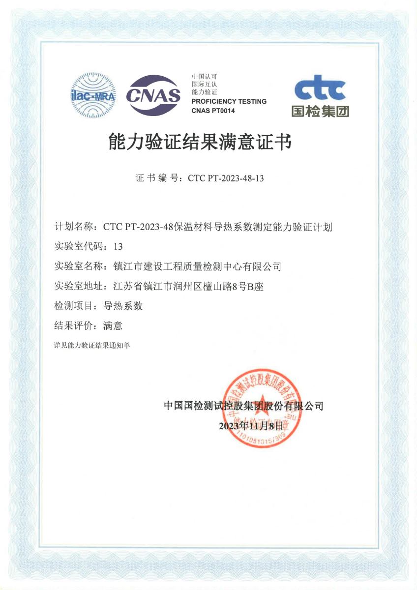 检测中心于2023年9月均参加了由中国建材检验认证集团股份有限公司组织的“CTC PT-2023-48保温材料导热系数测定能力验证计划”,提交的导热系数检测结果满意,顺利通过了此次能力验证。