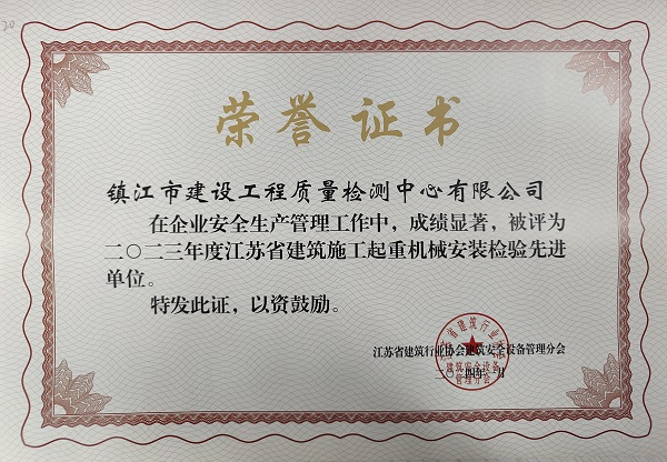 在刚刚过去的2023年度江苏省建筑行业协会建筑安全管理分会组织的全省起重设备安装检测先进单位评比中,我中心以专业严谨的检测能力、及时高效的服务质量得到了客户及省行业主管部门的一致认可和赞誉。我中心在全省近百家企业中脱颖而出荣获“2023年江苏省建筑施工起重机械检验先进单位”。这是省行业主管部门及协会对我中心检验检测工作的充分肯定,我们将以此为契机进一步加强检验检测的能力学习,提升自我的检测能力水平,在来年的工作中以更严谨的态度、更扎实的工作作风、更高效的服务质量为保障镇江市的建筑机械施工安全贡献自己的一份力量!
