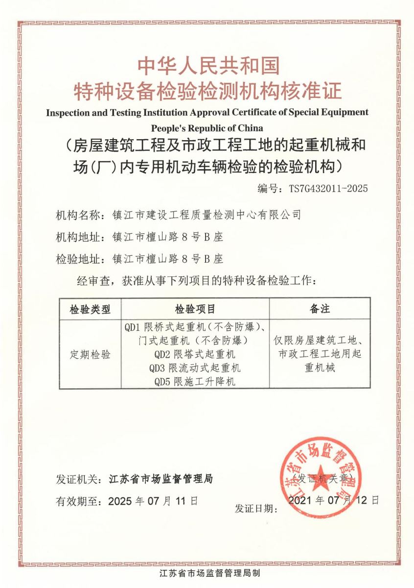 江苏省建筑施工起重机械安装检验机构信用评价证书