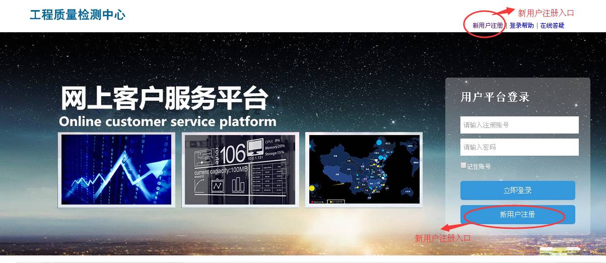 1.通过www.zjjczx.com网站首页(图1)的banner区域可以进入平台登录页面(图3),紧随banner区域正下方的功能区域用于链接专项功能直接登陆页面(图2)。如果为首次使用的客户,请先点击“新用户注册”链接到新用户注册页完成注册,注册成功后记住注册的用户名和密码,等待检测中心的审核,中心审核通过后,即可登录平台进行相关操作。