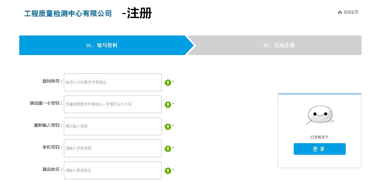2.注册页面内容见下图(图4、图5、图6)。登陆账号、密码、手机号、真实姓名等带*号和绿色圆形图标标志的信息为必需填写信息(图4),下面的工程、单位、见证人信息为可选填信息(图5),注册的时候可不填写,在以后的使用过程中还可以补填完整;建议填写完整,因为后期使用平台进行委托时,将会使用此处信息作为默认信息带入信息录入界面,从而减少输入工作。进行用户注册时,为了避免恶意注册,需要录入验证码信息(图6)。