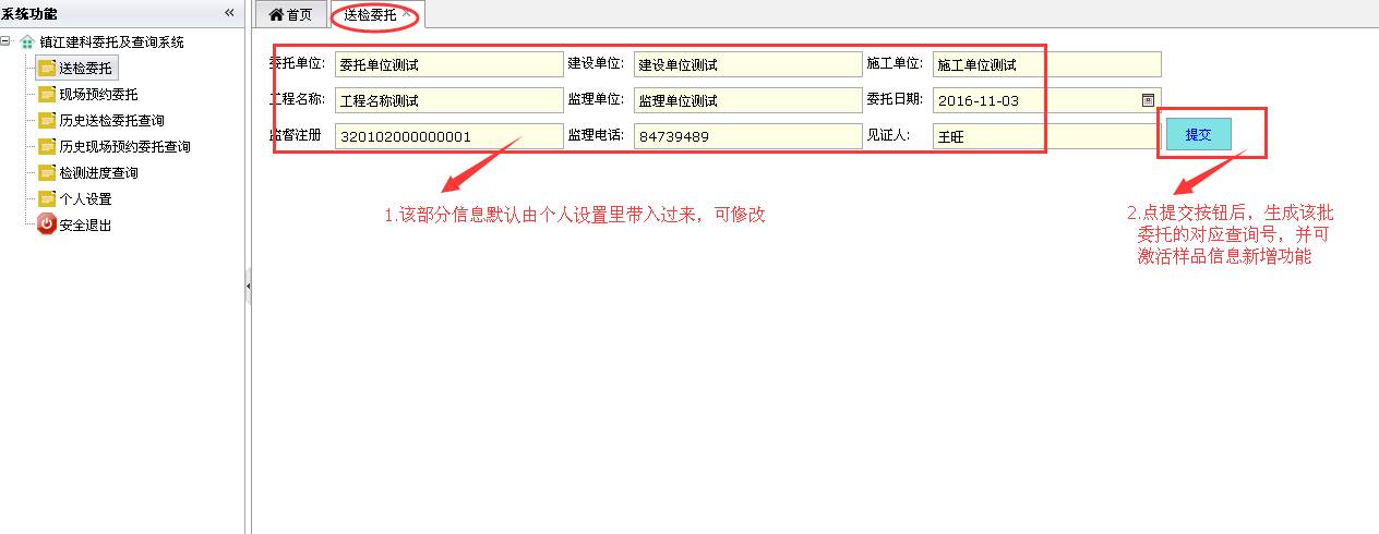 1.样品信息的委托分送检委托和现场预约委托,两者操作方法一样,下面以送检委托为例加以说明(图7)。可通过网站首页的送检委托功能直接登录打开委托页面,或者平台登陆功能区登录后,点左侧的功能菜单区的送检委托打开页面。页面中的默认信息从个人设置那里带入,可进行编辑,确认信息无误后,直接点[提交]按钮即可生成查询号或者叫委托号(网络)