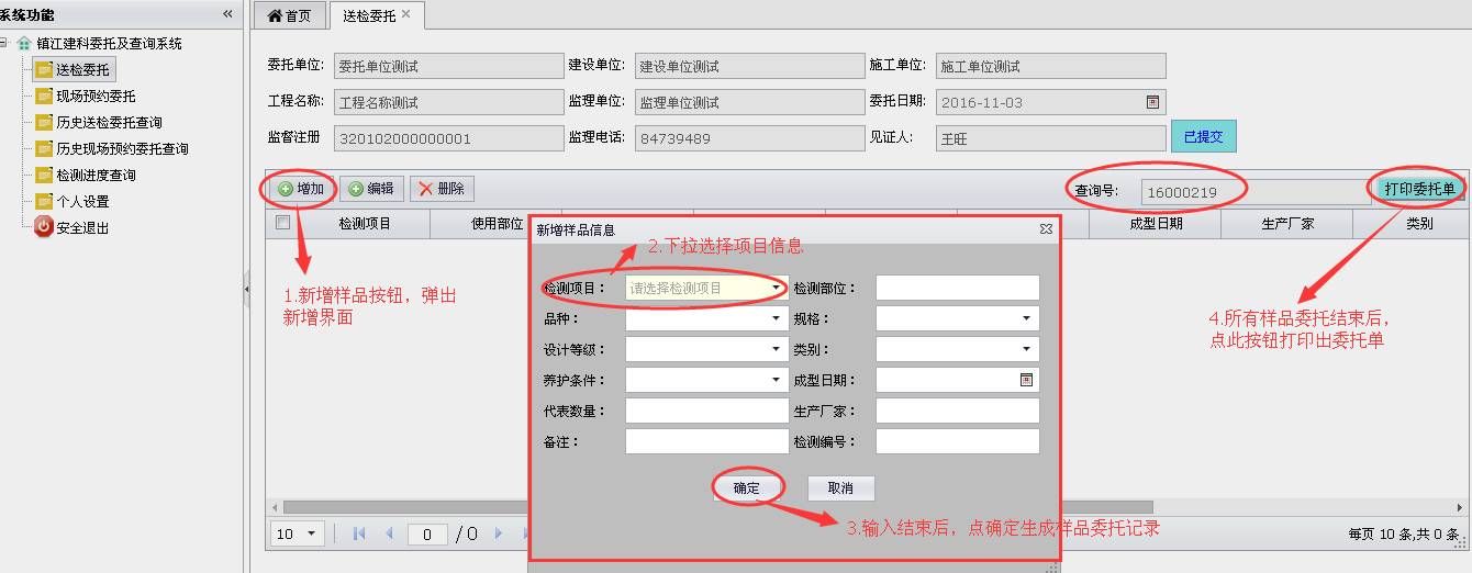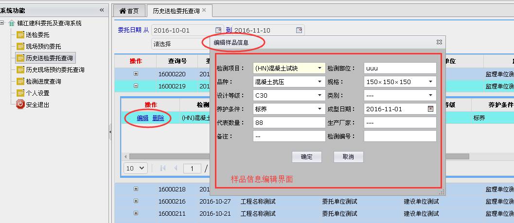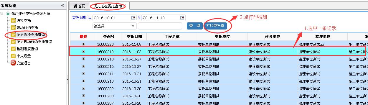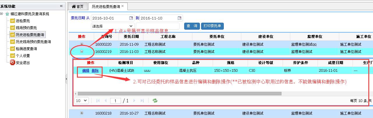 1.历史委托查询分送检委托和现场预约委托,两者操作方法一样,下面以送检委托为例加以说明(图10)。通过平台登陆功能区登录后,点左侧的功能菜单区的 [历史送检委托查询] 打开页面。页面中有委托日期和下拉选择框中的工程名称、委托单位、监理单位等查询条件可供使用,设置好查询条件后点[查询]按钮即可完成查询,选中某条样品信息记录后,点[打印委托单]按钮,可进行委托单打印(图13)。点开“+”号操作按钮,可显示某查询号(或者叫委托号(网络))下具体的每条样品信息,可针对某条样品信息进行编辑和删除操作。