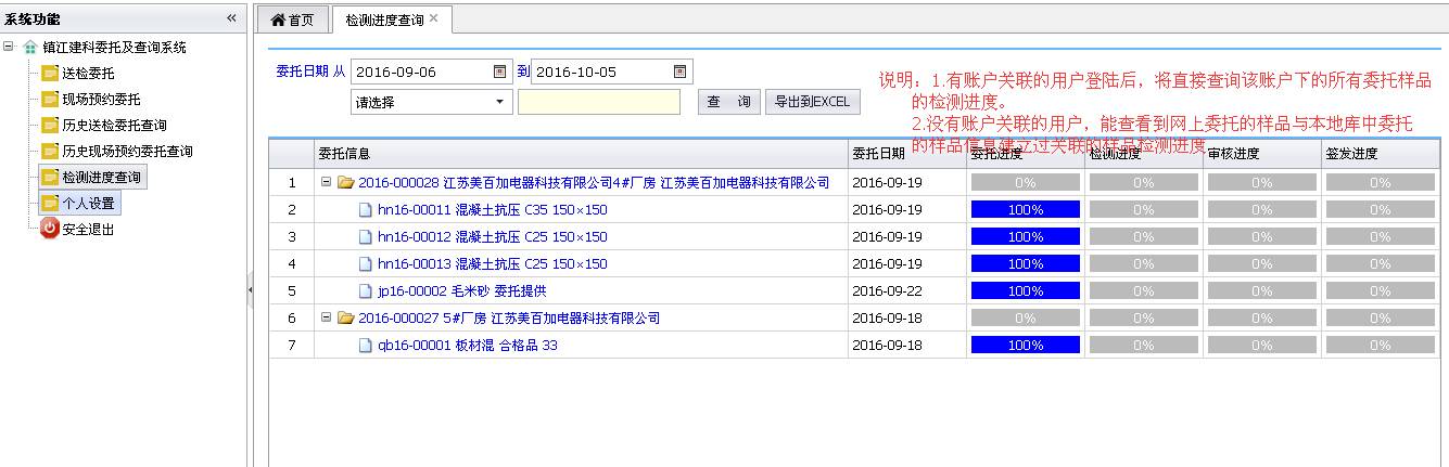 1. 可通过网站首页的检测进度查询功能直接登录打开查询页面,或者平台登陆功能区登录后,点左侧的功能菜单区的检测进度查询打开页面(图16)。页面中有委托日期和下拉选择框中的工程名称、委托单位、监理单位等查询条件可供使用,设置好查询条件后点[查询]按钮即可完成查询。点[导出到EXCEL]按钮可将查询出的信息以EXCEL文件的形式导出。