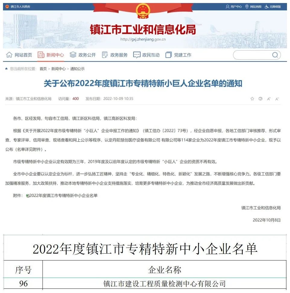近日,检测中心荣列市工信局公布的2022年度镇江市专精特新“小巨人”企业名单。